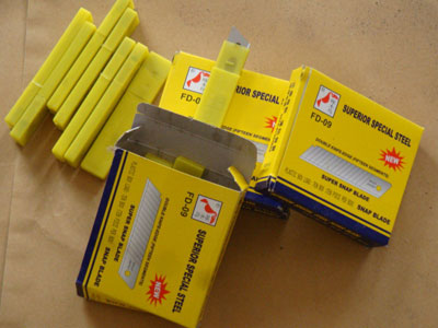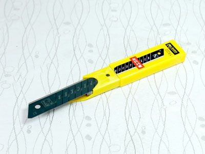 美工刀也俗稱刻刀或壁紙刀,是一種美術(shù)和做手工藝品用的刀,主要用來切割質(zhì)地較軟的東西,多為塑刀柄和刀片兩部分組成,為抽拉式結(jié)構(gòu)。也有少數(shù)為金屬刀柄,刀片多為斜口,用鈍可順片身的劃線折斷,出現(xiàn)新的刀鋒,方便使用。美工刀有大小多種型號。